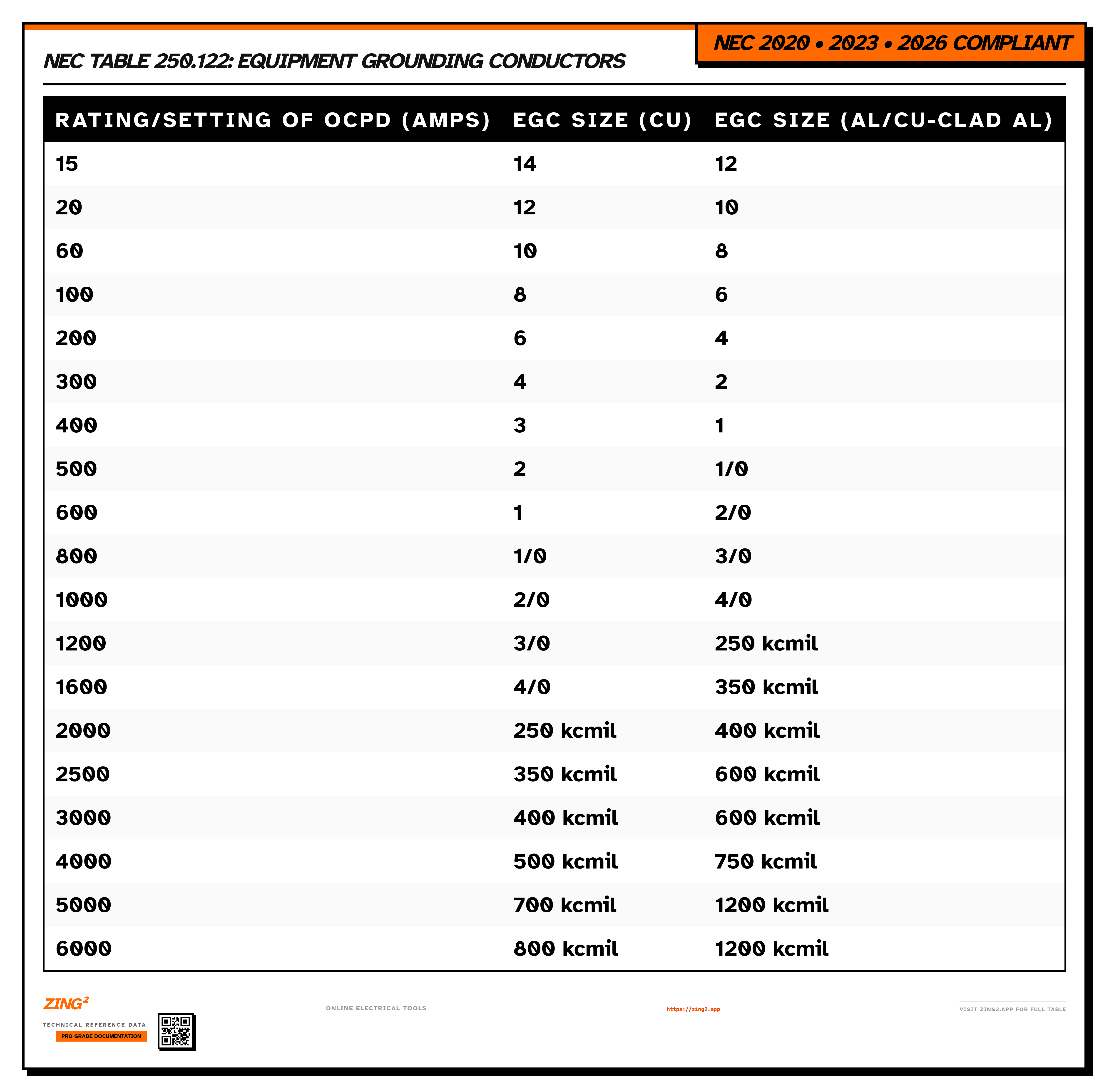 This data is provided for informational purposes only. Always verify with the latest edition of the National Electrical Code (NFPA 70) and consult with a licensed electrical professional or AHJ (Authority Having Jurisdiction) before performing any electrical work. Zing² is a reference tool, not a substitute for qualified engineering.