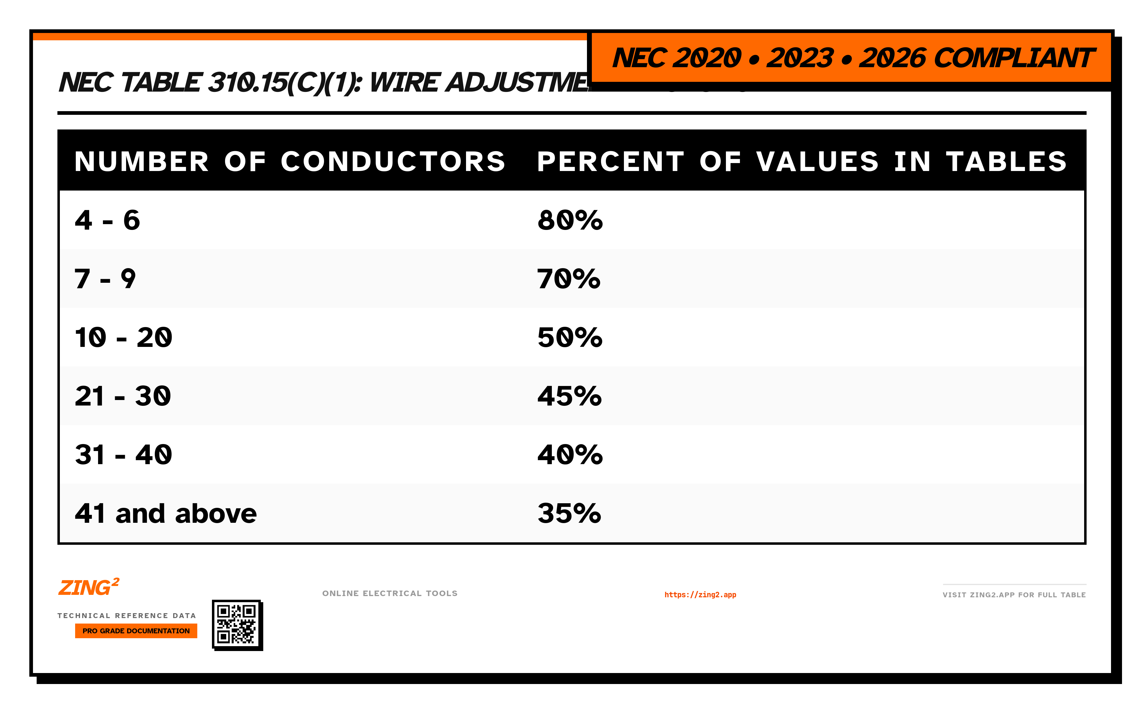 This data is provided for informational purposes only. Always verify with the latest edition of the National Electrical Code (NFPA 70) and consult with a licensed electrical professional or AHJ (Authority Having Jurisdiction) before performing any electrical work. Zing² is a reference tool, not a substitute for qualified engineering.