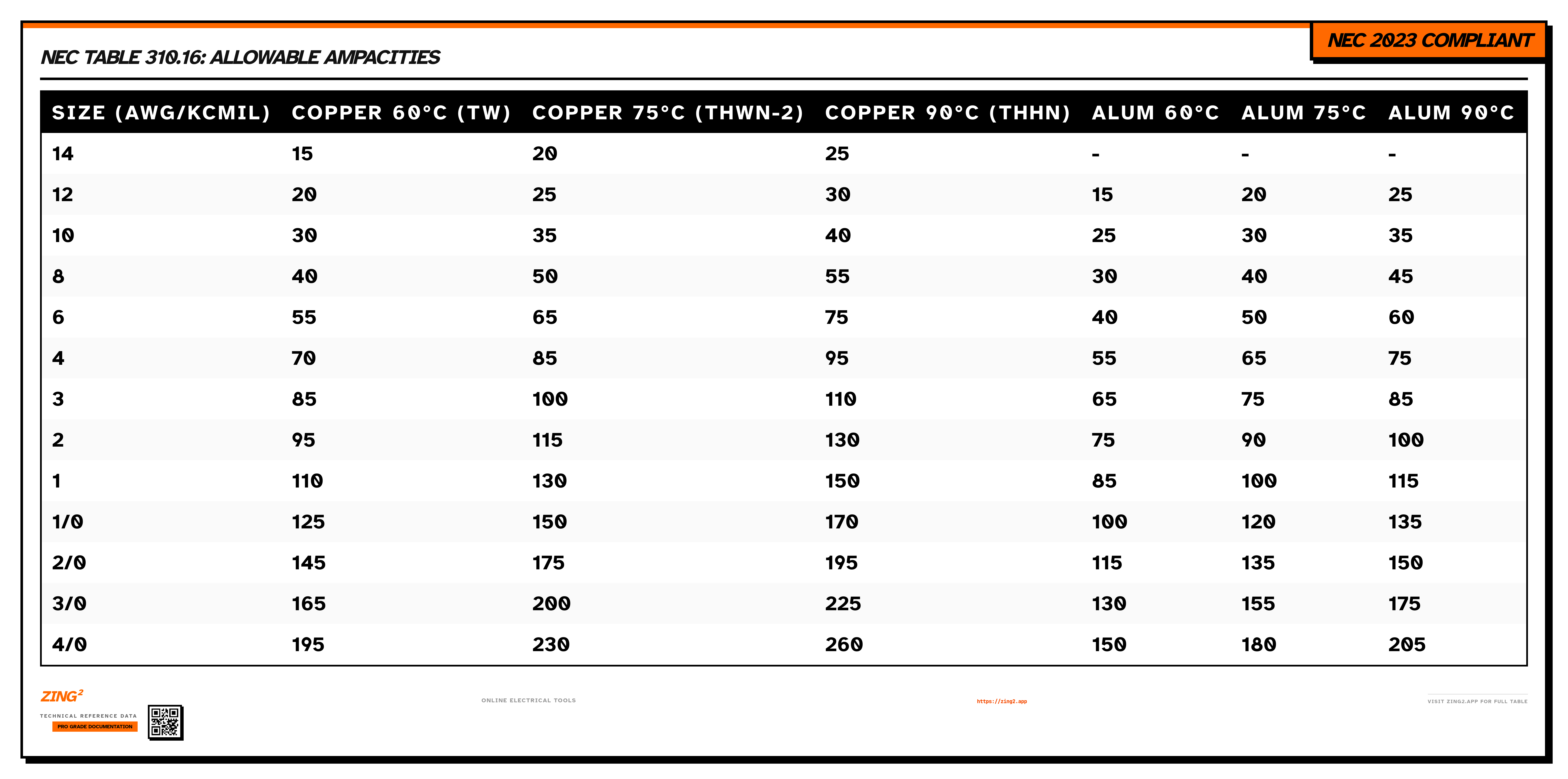 This data is provided for informational purposes only. Always verify with the latest edition of the National Electrical Code (NFPA 70) and consult with a licensed electrical professional or AHJ (Authority Having Jurisdiction) before performing any electrical work. Zing² is a reference tool, not a substitute for qualified engineering.