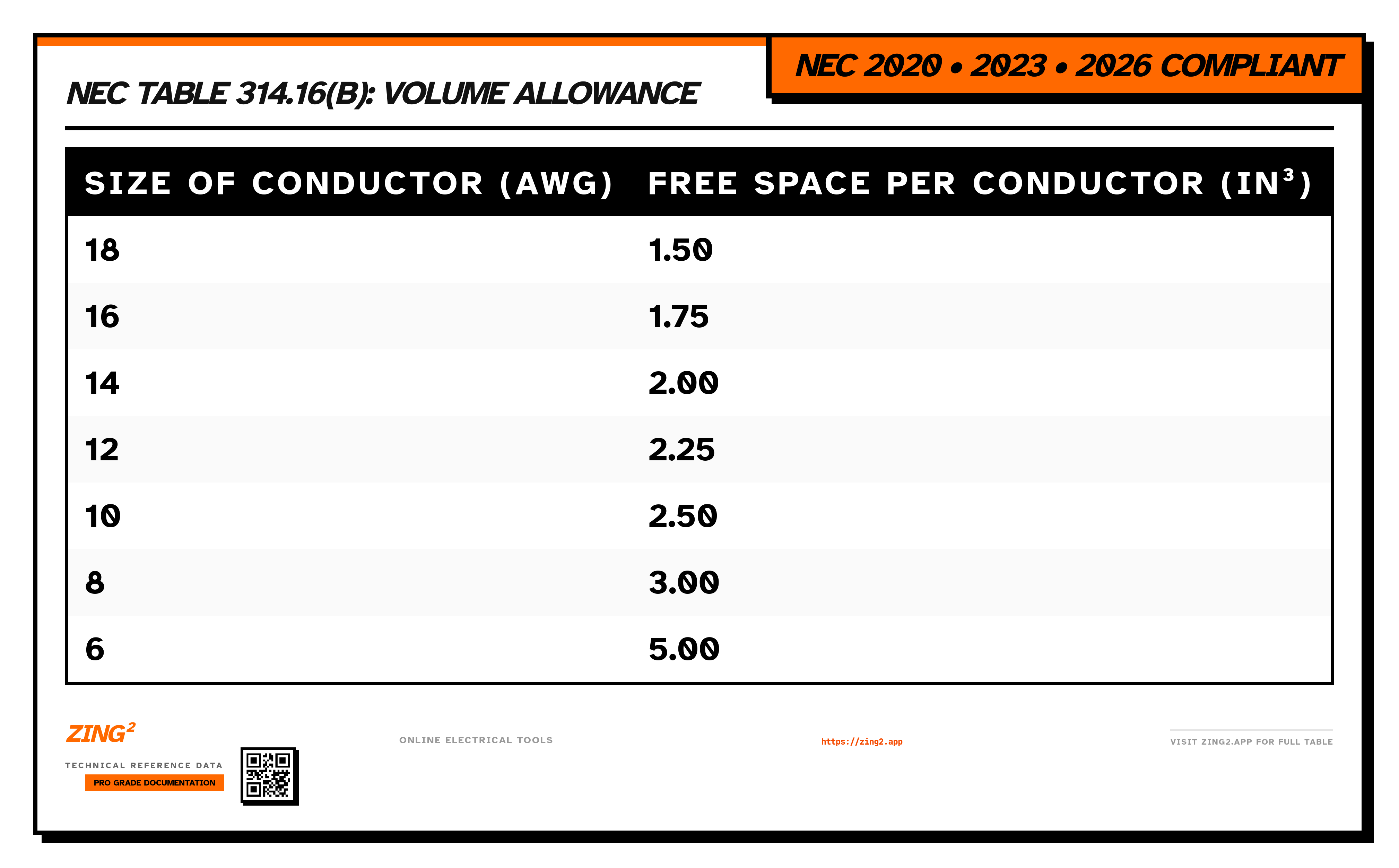 This data is provided for informational purposes only. Always verify with the latest edition of the National Electrical Code (NFPA 70) and consult with a licensed electrical professional or AHJ (Authority Having Jurisdiction) before performing any electrical work. Zing² is a reference tool, not a substitute for qualified engineering.